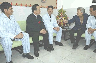 上午十時三十分,溫家寶和國務(wù)院副總理吳儀在中共北京市委書記劉淇,北京市代市長王岐山陪同下,來到北京市地壇醫(yī)院。這所醫(yī)院是目前中國內(nèi)地唯一擁有艾滋病藥物研究資格的國家級臨床基地,至今已診治六百余例艾滋病患者。