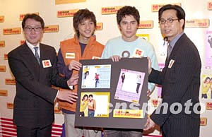 樂壇組合Shine成員黃又南、徐天佑12月2日在香港出席《Kodak數(shù)碼沖曬多面睇》記者會,Kodak更設(shè)計了一套三款的「Kodak ×Shine 2004慈善相片年歷」予香港世界宣明會作慈善用途。中新社記者:鄧慶樂