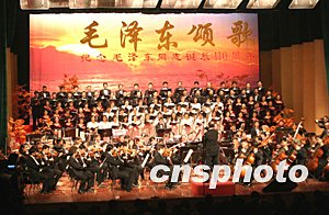 為紀(jì)念毛澤東誕辰110周年,《毛澤東頌歌大型音樂會》十二月五日晚在北京民族宮劇場舉行。中國最高級別文藝團(tuán)體演出的歌唱毛澤東頌歌,讓人回憶起激情燃燒的歲月。中新社記者:史利