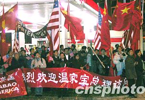 華盛頓僑界9日夜在溫家寶總理演講會(huì)場外集會(huì),高呼“國家統(tǒng)一,反對(duì)分裂”口號(hào)。中新社記者:余東暉