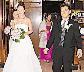 婚禮酒會開始時,身穿婚紗的翁虹與新郎伍偉杰在現(xiàn)場鋼琴和小提琴伴奏下進(jìn)場,一對新人進(jìn)行交換戒指及祝酒儀式后,再由雙方家長上臺致辭,然后新郎哥便輕吻新娘子面頰宣示禮成,其間翁虹一度感觸至兩眼通紅,場面溫馨。