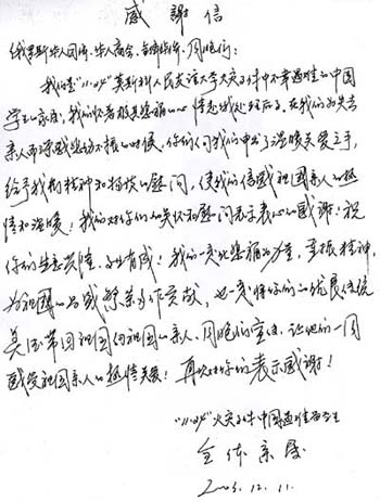 我們是“11·24”莫斯科人民友誼大學(xué)火災(zāi)事件中不幸遇難的中國留學(xué)生家屬,我們懷著極其悲痛的心情赴俄處理后事。在我們?yōu)槭ビH人而深感悲傷不振的時(shí)候,你們向我們伸出了溫暖關(guān)愛之手,給予我們精神和物質(zhì)的慰問,使我們信感祖國親人的熱情和溫暖。我們對(duì)你們的關(guān)懷和慰問表示衷心的感謝!祝你們生意興隆、事業(yè)有成!