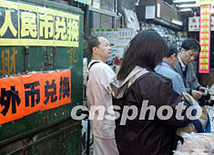 里昂證券預測,明年內(nèi)地訪港旅客最少達一千二百萬人次,總消費額將達五百九十億港元,較今年高出至少二百億港元,相信有利創(chuàng)造香港本地的就業(yè)機會。圖為時下香港鬧市區(qū)人民幣兌換業(yè)務繁忙,已顯內(nèi)地游客訪港臨近高峰。作者:潘索菲