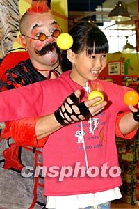 來自俄羅斯的莫斯科馬戲團十二月十六日在香港舉行演出發(fā)布會,該團將在香港連續(xù)進行為期數月的演出活動,全新的馬戲節(jié)目為香港觀眾帶來歡樂、刺激的新感受。圖為馬戲團小丑指導小朋友練雜耍。中新社記者:錢興強