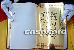 為紀(jì)念毛澤東誕辰110周年,由中央文獻(xiàn)出版社出版的純金版《毛澤東詩詞手跡》十六日在蘇州限量發(fā)行。金書以純度達(dá)99.9%的黃金紙為材質(zhì),詩詞集為古籍16開本,封面上鑲嵌著純金的毛澤東頭像紀(jì)念章,36頁金紙收錄了《沁園春·雪》等17幅毛澤東詩詞手跡。這部金書海內(nèi)外限量發(fā)行5000套,每套定價(jià)18600元人民幣。作者:蔣振江