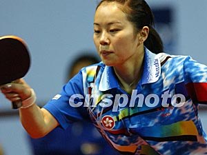 香港選手柳絮飛在二零零三年女子世界杯乒乓球賽十二月十八日進(jìn)行的賽事上以4:0擊敗羅馬尼亞選手巴蒂斯庫。中新社記者:錢興強(qiáng)