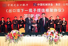 十二月二十二日,中國(guó)進(jìn)出口銀行與中國(guó)機(jī)械裝備(集團(tuán))公司在北京簽署了總額為15億美元的出口項(xiàng)下一攬子授信框架協(xié)議,主要用于支持該公司在未來(lái)三年內(nèi)的境外投資、對(duì)外承包工程及機(jī)電產(chǎn)品、高新技術(shù)產(chǎn)品出口等項(xiàng)目。圖為中國(guó)進(jìn)出口銀行蘇中副行長(zhǎng)(前排左)和中國(guó)機(jī)械裝備(集團(tuán))公司趙風(fēng)茂(前排右)副總裁代表雙方簽署協(xié)議。中新社記者:張勤