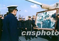 毛澤東于1953年2月19日首次視察解放軍海軍部隊,在武漢登上“洛陽”艦和該艦官兵一起航行,并揮毫題詞:“為了反對帝國主義的侵略,我們一定要建立強大的海軍”!奥尻枴迸灩俦12月20日在毛主席與“洛陽”艦官兵交談的巨幅照片前重溫領(lǐng)袖題詞,紀念毛澤東誕辰110周年。作者:毛昭勝