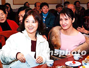圣誕前夜,北京《夢回紅樓》酒家召集電視連續(xù)劇《紅樓夢》部分原班人馬茶敘,宣布電視劇《紅樓夢》重拍正式起動。圖為出席會議的原《紅樓夢》中妙玉的扮演者姬陪杰(右)和賈惜春的扮演者胡澤紅(左)。中新社記者:王麗南