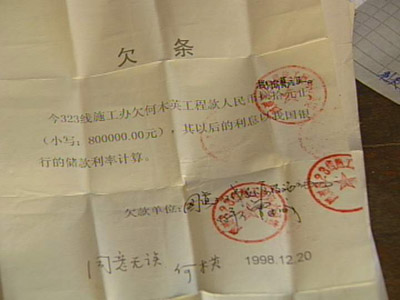 記者計算了一下,僅他們5位手中欠條上的欠款就達300多萬元,涉及到200多個民工的工資。據調查,323國道廣東乳源縣城段工程共拖欠民工工資達1300多萬元,涉及施工隊60多個,民工670多人。拖欠時間長達8年多。