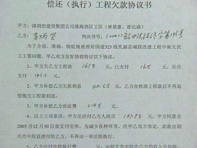 鄒遠貴:“我追了八年債,我沒回過家。沒辦法回去,1997年我父親去世了,我哭了10次。”據他們介紹,這條路是1994年3月上馬的,當時乳源縣政府以招商引資的方式引來廣西梧州明興房地產開發(fā)公司、深圳建設集團公司珠海西區(qū)工區(qū),三方約定:工程總投資5800萬元,由甲方乳源縣政府以征地、拆遷等形式出資580萬元,乙方廣西梧州方出資1000萬元,丙方深圳珠海工區(qū)自籌其余工程款4220萬元,并以大包干的形式負責工程項目的全部施工建設。然而在實施過程中,資金卻出現(xiàn)了問題。