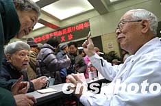 當(dāng)年曾是毛主席醫(yī)療小組成員的王新德教授(右)十二月二十六日在北京醫(yī)院用為市民們義診來紀(jì)念毛主席誕辰110周年。中新社記者:史利