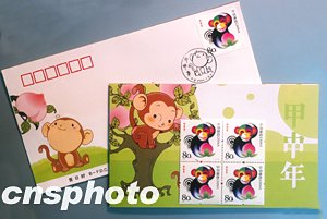2004年是甲申年,按中國十二生肖排序為猴年。北京市郵票公司為配合國家郵政局在2004年1月5日發(fā)行《甲申年》特種郵票(生肖猴票、1套1枚),特設(shè)計和印制了該郵票的首日封(左)、郵折(右)等郵品,與郵票同時發(fā)行!都咨昴辍诽胤N郵票面額是80分。中新社記者:鄒憲