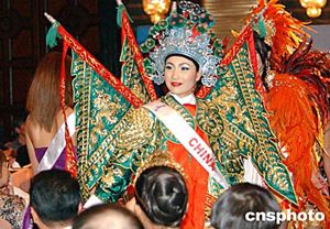 今年十九歲的中國小姐邢會原以一身京劇中的“大靠”形象進場,英姿颯爽中掩不住萬般嫵媚,引起觀眾一片驚艷;并因此獲得了“最佳民族服裝獎”稱號。她目前在英國牛津布魯克斯大學攻讀法律和市場營銷專業(yè)的雙學位。賽后她表示,雖然自己很興奮能拿獎,覺得是為中國爭光,但仍將繼續(xù)學業(yè),因為她認為學習最重要。