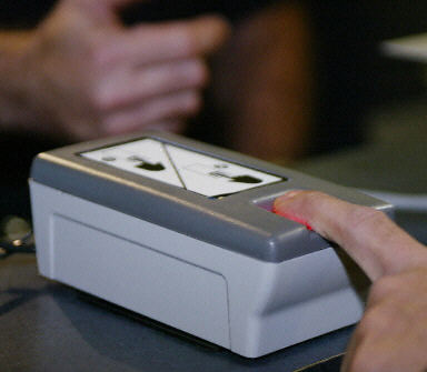 2004年1月5日,在洛杉磯國際機(jī)場,美國海關(guān)及邊境安全部門的官員展示新的指紋識別及拍照系統(tǒng)。從5日起,美國全境將推廣使用該系統(tǒng),對進(jìn)入美國的外國游客進(jìn)行身份識別。