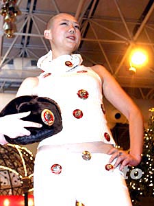 新春佳節(jié)即將來臨,各種聯(lián)誼活動(dòng)不斷推新,一位光頭模特在聯(lián)誼會(huì)上披掛毛主席像章上臺(tái)表演。中新社記者:史利