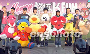 歌星梁漢文、方力申、組合Shine兩人、林嘉欣、鄭中基(左二起)1月6日在香港金鐘添馬艦舉行之《環(huán)球嘉年華2003/4》出席“Neway終極K Fun嘉年華”演唱會作表演嘉賓,獲環(huán)球嘉年華主辦機構(gòu)送上大型毛公仔。作者:鄧慶樂