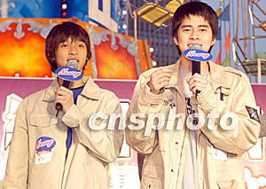 組合Shine兩人1月6日在香港金鐘添馬艦舉行之《環(huán)球嘉年華2003/4》出席「Neway終極K Fun嘉年華」演唱會作表演嘉賓,并呼吁歌迷上臺游戲。作者:鄧慶樂