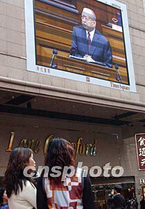 香港特別行政區(qū)行政長官董建華,元月七日在香港立法會上發(fā)表施政報告,在時代廣場許多市民通過電子顯示屏觀看立法會現(xiàn)場轉(zhuǎn)播實況。中新社記者:錢興強(qiáng)