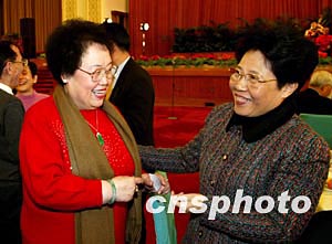 2004年僑界新春茶話會(huì)十四日在北京人民大會(huì)堂舉行,國務(wù)院僑務(wù)辦公室主任陳玉杰(右)與全國政協(xié)委員、香港富商陳麗華親切交談。中新社記者 毛建軍 攝
