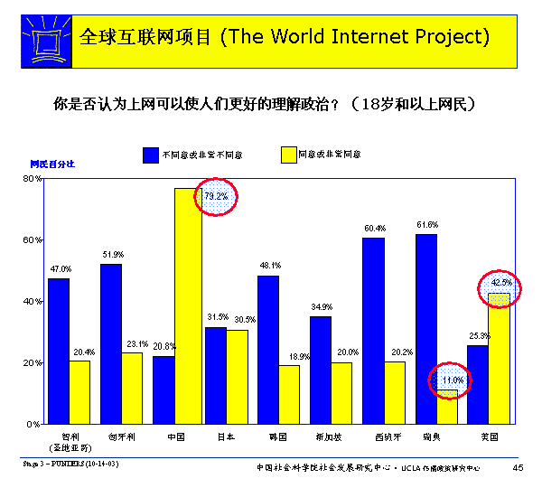 只有美國和中國的網(wǎng)民例外,中國的被訪網(wǎng)民中認(rèn)為網(wǎng)絡(luò)可以幫助人們更好地理解政治的人超過了三分之二。和前面的問題一樣,這一結(jié)論與兩年前的調(diào)查結(jié)果完全符合。