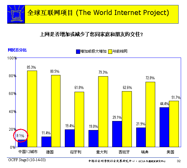 中國只有少量被訪網(wǎng)民認(rèn)為上網(wǎng)增加了他們同家庭和朋友之間的交往,很可能是因為中國人更加看重親友之間面對面的直接交往。