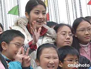 香港歌星陳慧琳元月十七日參加正在添馬艦廣場(chǎng)舉行的環(huán)球嘉年華活動(dòng),為“空中秋千”機(jī)動(dòng)游戲擔(dān)任操作員并與小朋友一起蕩秋千。作者:錢(qián)興強(qiáng)