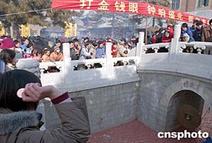 農(nóng)歷新年伊始,北京白云觀廟會(huì)上的傳統(tǒng)民俗活動(dòng)吸引大批市民。在窩風(fēng)橋畔,“打金錢(qián)眼”的市民不停地向橋下的銅鈴?fù)稊S“銅錢(qián)”,清脆的撞擊聲不絕于耳。據(jù)說(shuō),打中銅鈴者不但會(huì)吉祥如意,而且“財(cái)源滾滾”。中新社記者:張煒