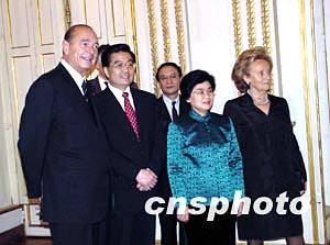 中國(guó)國(guó)家主席胡錦濤一月二十六日開(kāi)始對(duì)法國(guó)進(jìn)行為期三天的國(guó)事訪問(wèn),法國(guó)總統(tǒng)希拉克當(dāng)日晚上在愛(ài)麗舍宮舉行國(guó)宴歡迎胡錦濤。圖為希拉克夫婦和胡錦濤伉儷共同會(huì)見(jiàn)來(lái)賓。作者:蔚中