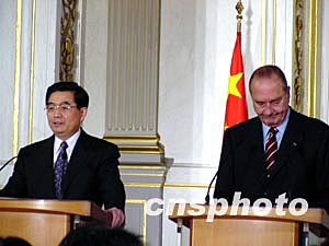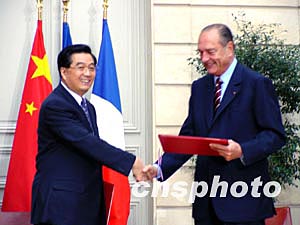 今天是中法建交四十周年紀(jì)念日,正在法國(guó)進(jìn)行國(guó)事訪問的中國(guó)國(guó)家主席胡錦濤和希拉克在巴黎進(jìn)行了正式會(huì)談,會(huì)談后雙方簽署了“中法聯(lián)合聲明”。該聲明強(qiáng)調(diào),中法兩國(guó)將深化全面戰(zhàn)略伙伴關(guān)系,致力于建立更加安全、更加尊重多樣性和更加團(tuán)結(jié)的世界。作者:蔚中
