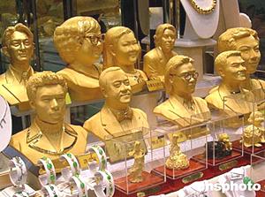 香港首飾店推銷有道,在商店櫥窗里擺出眾多香港明星造像,配以黃金首飾吸引游客觀賞購物。作者:錢興強