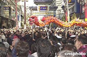 以著名的日本橫濱中華街為終點(diǎn)站的“未來(lái)港”地鐵新線二月一日正式開通,橫濱華僑在街頭以傳統(tǒng)舞龍慶賀這個(gè)著名華埠有史以來(lái)首次開通地鐵。作者:王健