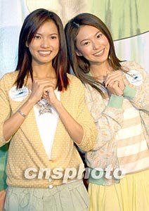 樂壇組合2R兩名成員黃婉君(Roseane)、黃婉佩(Race)(左起)2月4日在香港出席化妝品牌Biotherm《2004呵護皮膚色彩系列色彩大使》記者會,春節(jié)期間兩人離港返回新加坡探親,回港后于活動上向大家拜年。作者:鄧慶樂