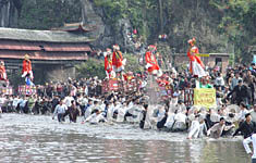 富有濃郁客家風(fēng)情的羅坊“走古事”,2月5日在“客家祖地”閩西連城縣羅坊鄉(xiāng)舉行,第四屆中國(guó)冠豸山客家民俗文化節(jié)由此拉開(kāi)帷幕。羅坊“走古事”系由幾隊(duì)人馬各抬一架“古事”(上有一古裝打扮孩童),在陸上、水中爭(zhēng)先前行的民俗活動(dòng)。作者:黃翔