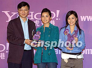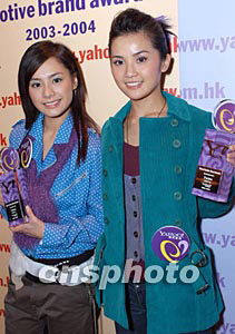 人氣組合Twins兩名成員鐘欣桐(右)、蔡卓妍2月5日在香港出席《Yahoo!感情品牌大獎2003-2004》頒獎典禮,Twins二人分別為「松日MP3」及化妝品牌「~H2O+」代言獲獎,雅虎香港總經理蔡寶德先生頒發(fā)兩個「感情品牌代言人」獎項予Twins二人。作者:鄧慶樂