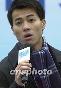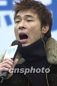 香港歌星梁漢文,二月七日在香港維多利亞公園舉行的“渣打馬拉松2004打氣音樂會”上冒雨為歌迷演唱。中新社記者:錢興強(qiáng)