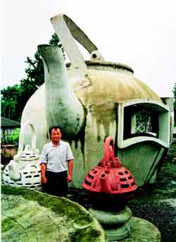 莊文亮最得意的是一組叫做“五‘壺’臨門”的五個(gè)大型茶壺。這五個(gè)大型茶壺,最大的直徑20尺,最小的16尺,比一般的涼亭還要大得多,說它是一棟小房子也不為過。只是這五個(gè)大茶壺如果真要拿來泡茶,一壺茶恐怕就要上百斤茶葉、幾十噸的水,非得出動(dòng)大吊車才行。