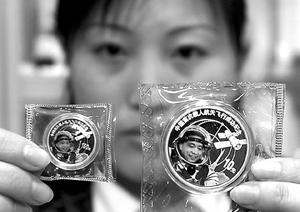 中新網(wǎng)2月11日電 據(jù)《北京青年報》報道,由中國人民銀行發(fā)行的中國首次載人航天飛行成功紀念金幣、銀幣昨天上午在京上市。楊利偉形象首次進了金銀紀念幣。