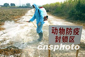 中國內(nèi)地首發(fā)禽流感疫點--隆安縣丁當電灌站入口二月十二日工作人員在定時消毒。疫情發(fā)生后,這里嚴格按照規(guī)定進行定時消毒。中新社記者:宋吉河