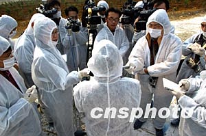 中新社隆安二月十二日電 (記者 趙勝玉)“戴鞋套、穿隔離服、戴手套”,由國務(wù)院新聞辦組織的中外記者團(tuán)今天首次獲準(zhǔn)進(jìn)入中國內(nèi)地發(fā)現(xiàn)第一例禽流感的疫點——廣西隆安縣丁當(dāng)鎮(zhèn)丁當(dāng)電灌站采訪。