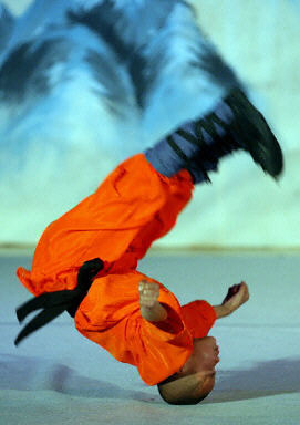 在臺(tái)灣訪問(wèn)的河南少林寺僧眾2月12日晚在臺(tái)北舉行和平祈福和慈善義演,他們?cè)诹x演中表演了少林棍、童子功、八段錦、炮錘、醉棍和羅漢十八手等功夫。