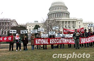 中新社華盛頓二月十二日電(記者余東暉)美國大華盛頓地區(qū)的華人和留學生十二日在國會山前集會,并向一百六十多名國會眾參兩院議員遞交聯(lián)合簽名信,表達反對臺灣當局搞“公投”和擔憂美中關系因此受到破壞的心聲。