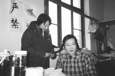 化妝間里,她正在梳辮子,一邊和聞訊過來看她的北影老演員樊姨聊著。在這部戲里,她演的艾蓮是右派的老婆、4個孩子的媽。穿上花棉襖,在《281封信》里時尚干練的老總一下子變成了上世紀70年代樸素內(nèi)向的母親。劉曉慶很喜歡這個造型,這讓她想起了以前拍攝《許茂和他的女兒們》、《芙蓉鎮(zhèn)》等的情景。其實她以前沒少演底層人物,只是后來看多了她的古裝美人,一時竟讓人對她的這種造型有些不信。這是她進組的第一天,5點就起床出門,估計得拍到天黑。導(dǎo)演對她和李幼斌的對手戲很滿意,進度順利。