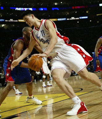 北京時(shí)間今天上午,NBA全明星賽在洛杉磯開戰(zhàn),中國球員姚明所效力的西部全明星隊(duì)以136-132擊敗了東部全明星隊(duì)。圖為姚明在比賽中帶球突破。