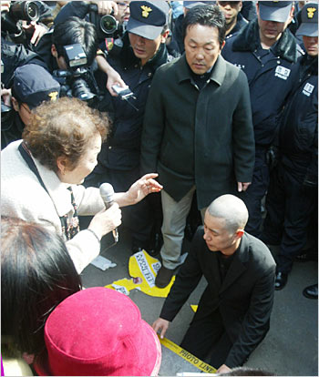 從上午11時30分起,8名慰安婦和30名韓國婦女團體成員在該娛樂公司總部前舉行示威,要求李成延和公司負責(zé)人直接道歉。下午1時30分,抗議者表示“要讓公司負責(zé)人道歉”,并試圖闖進公司。此時,樸智友來到眾人前,朗讀道歉聲明,并跪在慰安婦老人面前表示歉意。