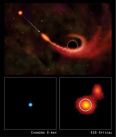 天文學(xué)家估計,上述黑洞的質(zhì)量是太陽的一億倍,而被撕裂的恒星則和太陽相若。黑洞吞噬了該恒星大約1%的物質(zhì),將其余的部分重新拋入太空。