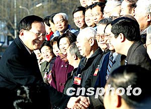 三月一日,中國國務(wù)委員唐家璇(左一)出席在北京舉行的中國人權(quán)研究會(huì)第二屆全國理事會(huì)二次會(huì)議并講話。中新社記者:鄭萍萍