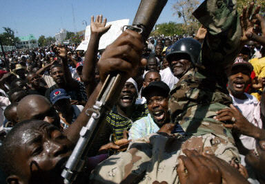 由“解放海地全國抵抗陣線”領導人菲利普率領的70多名反政府武裝士兵3月1日上午抵達首都太子港市中心。圖為人們歡迎反政府武裝士兵的到來。