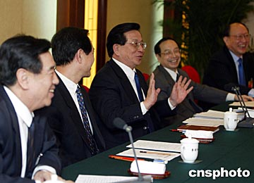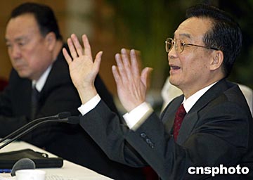 溫家寶今天來到出席全國政協(xié)十屆二次會(huì)議經(jīng)濟(jì)界和農(nóng)業(yè)界委員下榻的鐵道大廈。在經(jīng)濟(jì)界和農(nóng)業(yè)界聯(lián)組會(huì)上,溫家寶認(rèn)真聽取委員們的發(fā)言,他感謝委員們對(duì)政府工作的關(guān)心和支持,表示要認(rèn)真研究大家的意見和建議,努力改進(jìn)政府工作。