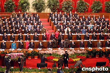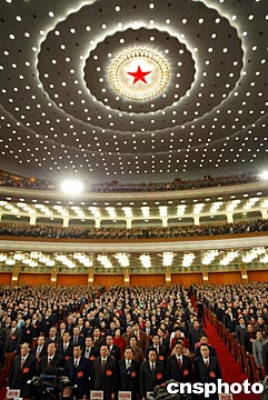 上午九時(shí)整,在熱烈的掌聲中,胡錦濤、江澤民、吳邦國(guó)、溫家寶、賈慶林、曾慶紅、黃菊、吳官正、李長(zhǎng)春、羅干等中國(guó)領(lǐng)導(dǎo)人步入會(huì)場(chǎng)。大會(huì)執(zhí)行主席、主席團(tuán)常務(wù)主席吳邦國(guó)宣布大會(huì)開幕。